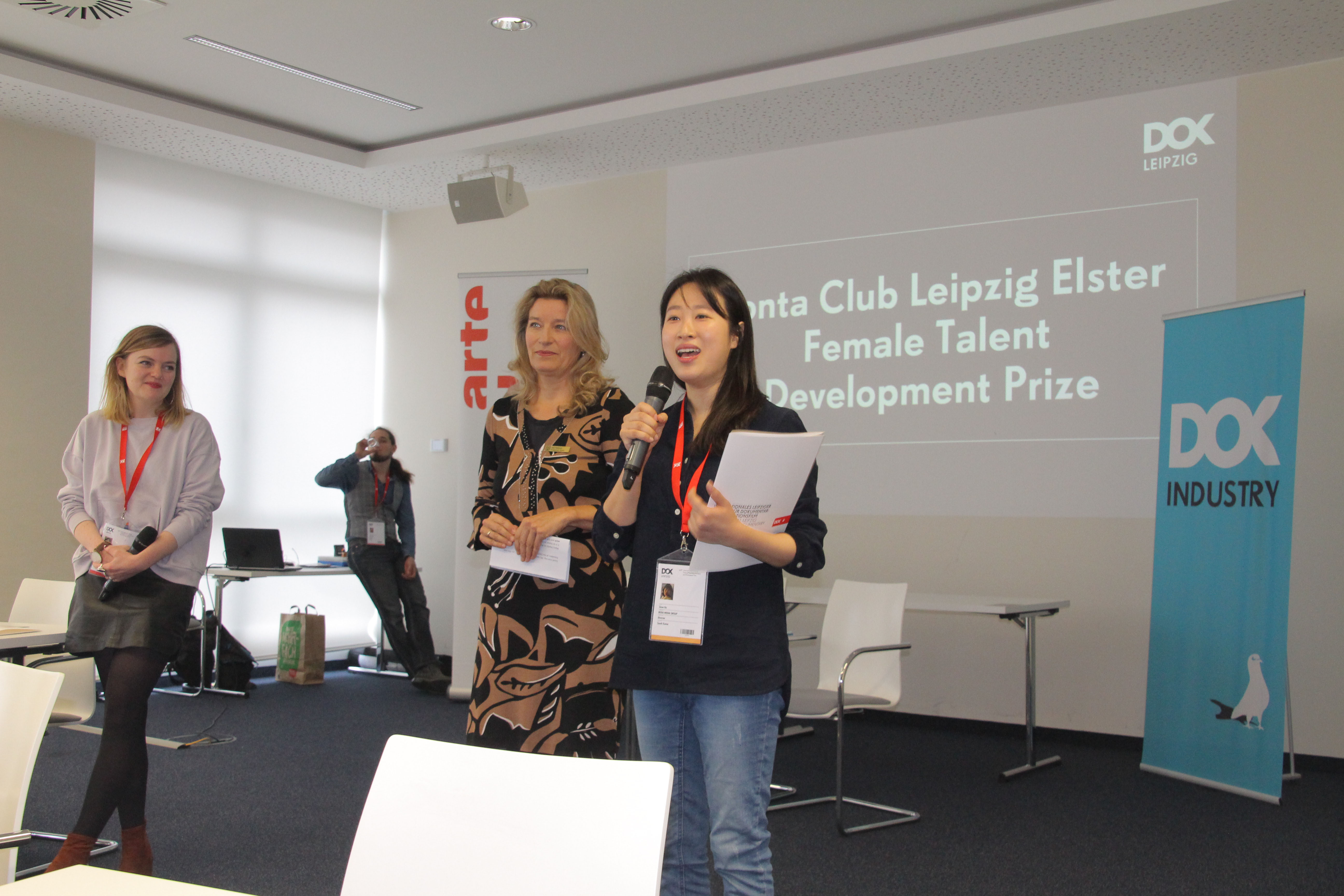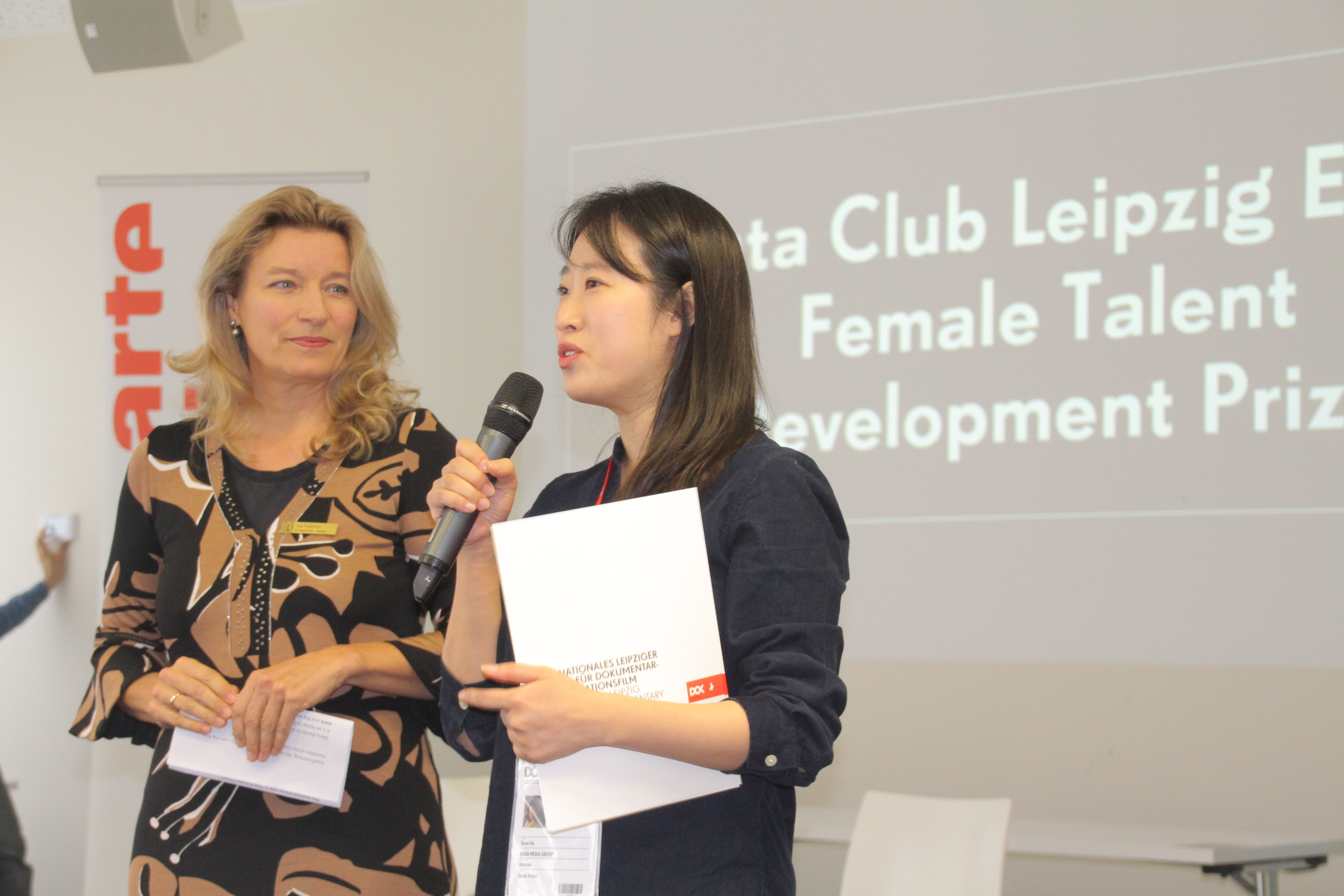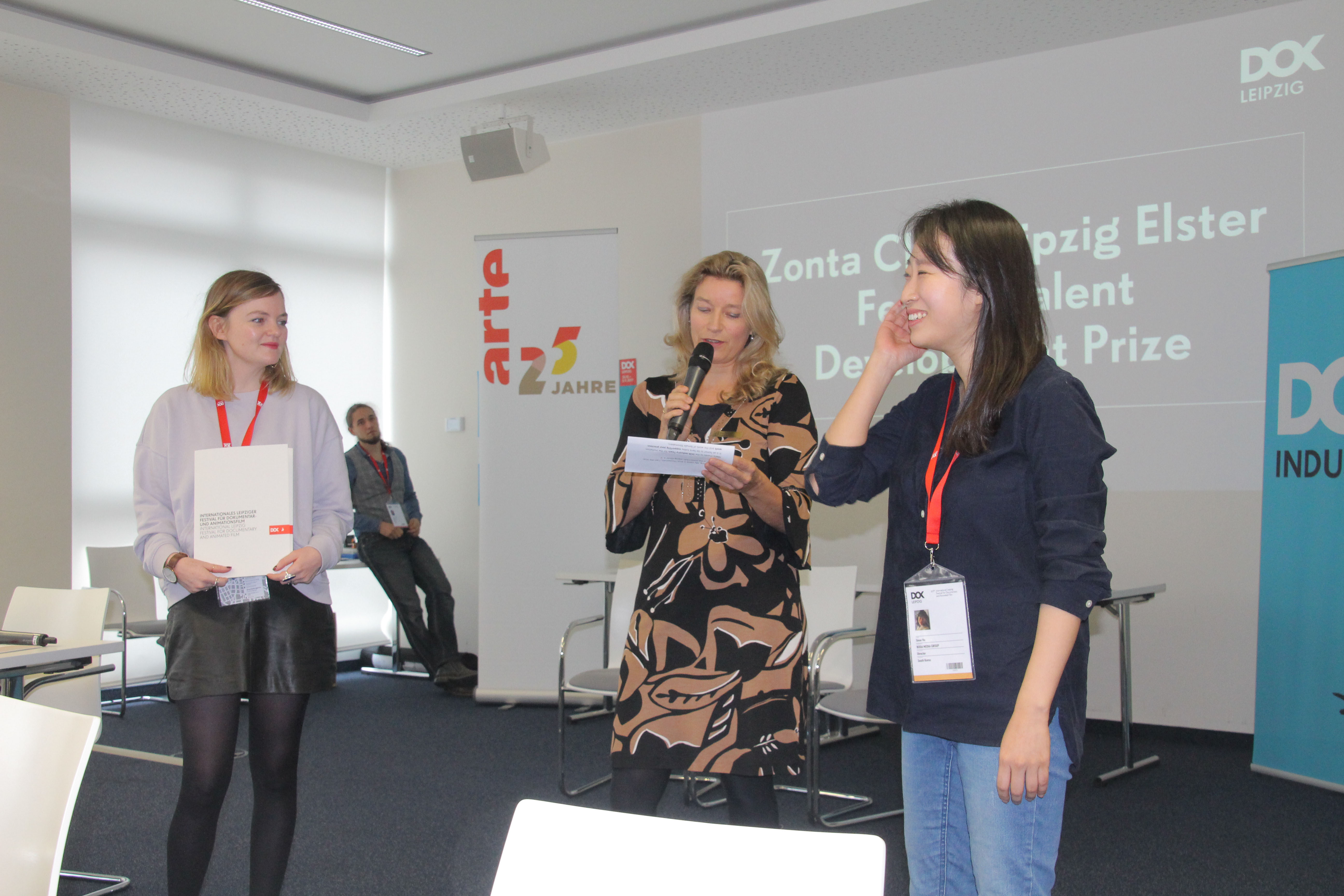 Zum ersten Mal übergibt Anja Theßenvitz, im Namen des Zonta Club Leipzig Elster, den gestifteten DOK-Filmpreis in Höhe von 1.000 Euro an die glückliche Sinae Ha aus Südkorea für ihr Projekt „The Primate Citizen“.
