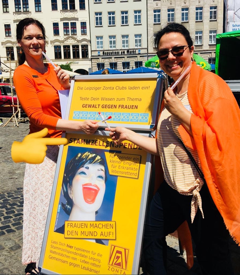 Wir waren mit einem knall-orange-farbenen Stand „ZONTA SAYS NO“ auf dem 3. Leipziger Frauenfestival. Gemeinsam mit unserem Leipziger Schwesterclub informierten wir zu spannenden Themen. Es gab ein Quiz zu Gewalt gegen Frauen – und natürlich auch etwas zu gewinnen. Nicht zuletzt führten wir eine Typisierungsaktion durch zugunsten der Knochenmarkspender-Datei zur Rettung von BlutkrebspatientInnen. Hier ein paar Eindrücke von unserem Stand: