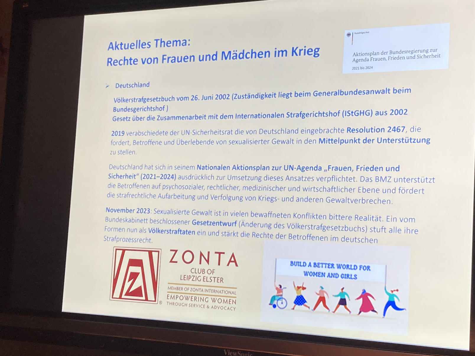 Mit internen Vorträgen zum Thema Gewalt gegen Frauen im Krieg und den Statements hierzu von Zonta International, der UN, von UN women, und Terre des Femmes im Vergleich starteten wir an diesem Clubabend in anregende Diskussionen.